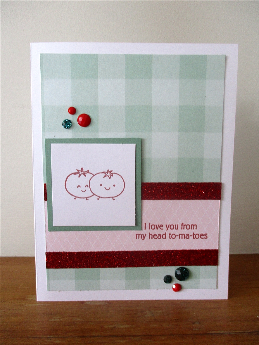 I had to use the tomatoes from my stamp set for the something red, and I paired it with the cute Gimme Some Sugar paper and some extra bling in the specified colours.